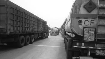 102省道临淄辛店段两侧停满了大罐车,长达百余米。 本报见习记者 刘晓 摄