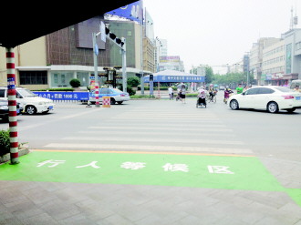 8日,新施划的由黄绿两色组成的“行人等候区”亮相老城区部分路口,显得十分醒目。据了解,当日,市中交警部门还在部分斑马线附近新增了礼让行人的标语,以保护行人利益,促进交通环境改善。 本报记者 袁鹏 摄影报道