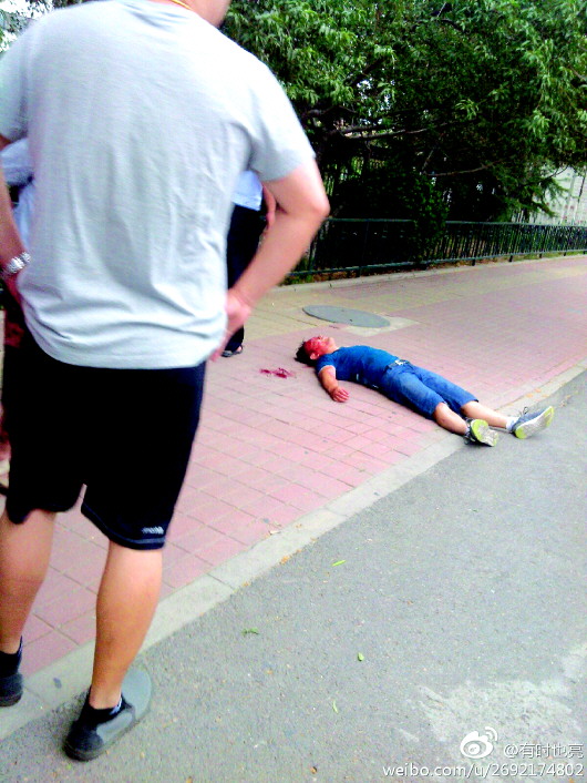 图为被群众合力围捕到的行凶男子正躺在地上。(微博截图,请图片作者与本报联系)