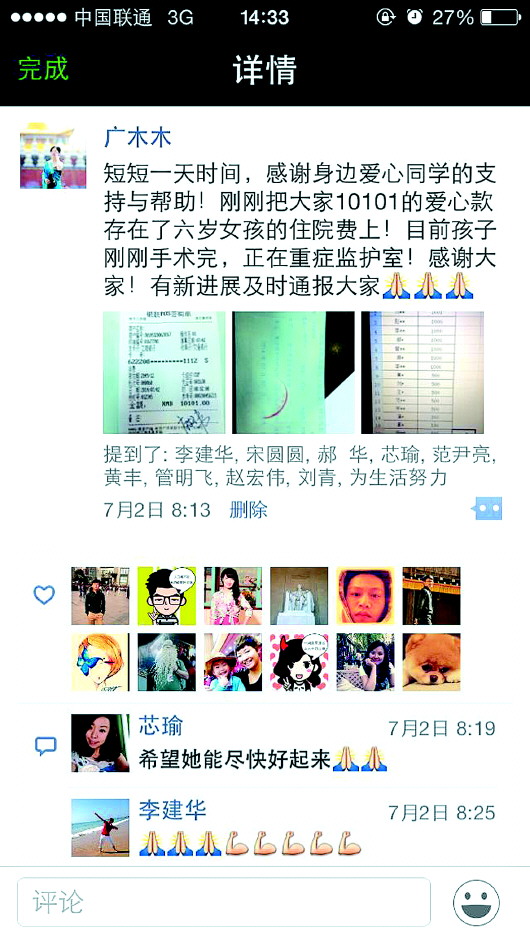将小明月的情况在自己的微信朋友圈发出一天后,麻玮得到十几位朋友、同事的支持。 麻玮微信截图