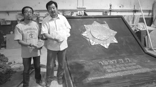 7月8日,邹锋(右)和赵覃(左)站在之前准备的独立自由勋章雕塑版本前。 本报记者 郑雷 摄