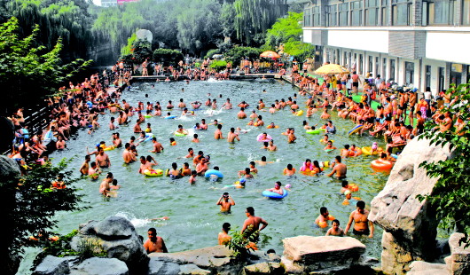 9日,济南湿度很高,闷热难受,人们纷纷寻找地方避暑。在泉水浴场内,人声沸腾。赶上中小学生放暑假,泳池内多了很多孩子的身影。本报记者 周青先 实习生 刘海天 摄
