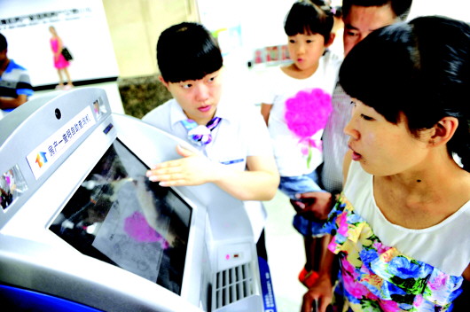 9日,在济南房产大厦,市民们正在“房产一查明”自助查询机前查询个人房产信息。 本报记者 王媛 摄