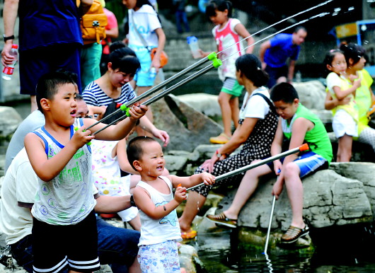 9日,在护城河畔白石泉,小孩在玩水枪。泉水是泉城的眼睛,爱泉护泉是市民应尽的职责。