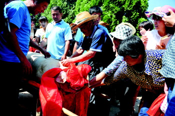 图为前来祭海的渔民,触摸祭祀品祈求平安吉祥。 本报记者 刘涛 摄