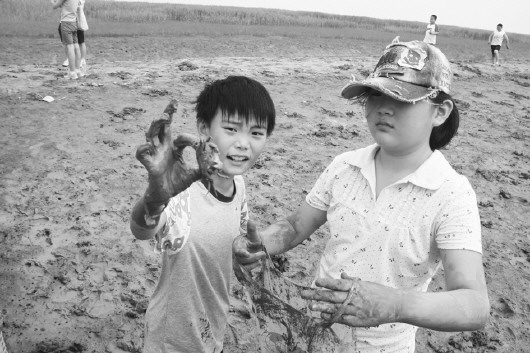 孩子们在海滩上采挖海蟹。