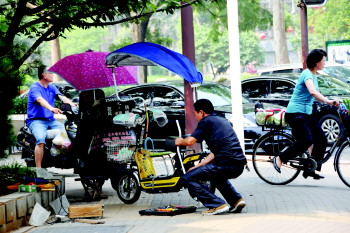 张店一家安装遮阳伞销售店前一工作人员在给一电动车安装遮阳伞。 本报记者 王鸿哲 摄