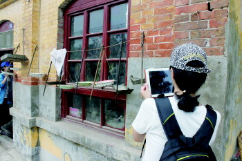 在临清锅市街,游客被挂在屋外的杆秤吸引。