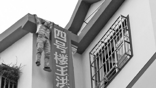 10日,记者在中韩边防派出所了解到,9日下午6点左右,有市民发现,在崂山区松岭路松竹新苑4号楼的6楼楼顶,一名男子打着横幅坐在楼顶的边缘,大喊着要跳楼。路过市民赶紧报了警,中韩边防派出所民警迅速赶往现场。在现场,民警看到一男子在6楼楼顶边缘处正拿着喇叭大声喊叫,并打出一横幅,横幅上写道:“四号楼王洪涛,归还车辆,还我租金”。民警见男子情绪激动,有坠落危险,就一边疏散围观市民,一边与消防部门、120急救中心联系,接着上到6楼一户居民家中隔着窗户对男子进行劝告,救援人员很快赶到,消防人员在楼下撑起了消防气垫。