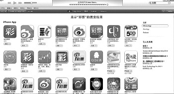 在电脑上登录苹果手机的App商店后,输入“彩票”二字,数百个与之相关的App弹出,其中“淘宝”、“新浪”等知名品牌赫然在列。