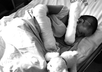10日下午2点多,在济宁市第一人民医院手足外科病房内,10岁的娜娜正在午休,脸部和头部长长的疤痕清晰可见,双臂被厚厚的绷带包裹着,手指处有斑斑血迹,让人一阵心悸。