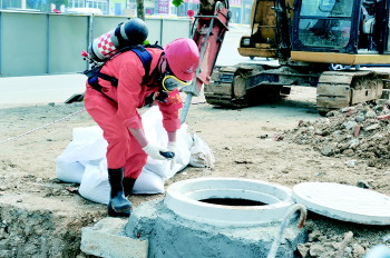 在演练过程中,现场模拟邹城市南外环鲁宁线212#桩附近混凝土路面下,输油管道发生腐蚀穿孔造成原油泄漏,在停输状态下,抢险队员到达现场后,对泄漏原油进行回收,并封堵周边市政窨井,防止原油进入城市管网。