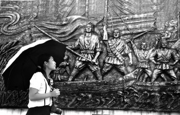 游客在铁道游击队纪念园内参观,雕塑上的情景历历在目。 本报记者 张晓科 摄