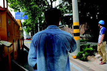 上午8点半正式上班后,趁着天气还相对凉爽些,于金亮就跟他的两名同事徐鹏、刘五超根据事先勘察的现场情况及安排赶往施工现场了,9点许他们准时来到位于新华路与新北宫街交叉口附近的一处配电施工现场。这次的任务是按照客户的要求重新上电。于金亮说,这项任务相对简单些,大约需要一个半小时的时间,自己主要负责现场安全监护,具体的上电操作由自己的两名徒弟徐鹏及刘五超执行。到现场后,他们就熟练地在施工现场外围竖上拉杆及围栏,防止路人行经此处可能发生的各种意外。
