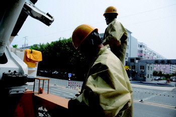 在简单的准备后,徐鹏与刘五超两人穿上严实的长袖防护服,然后就升到十多米外的高空开始正式的上电作业了。尽管近期潍坊天气还不算太热,但在火辣辣的大太阳曝晒下,没多长时间,在地面上负责监护的于金亮脸上就布满大颗大颗的汗珠了。