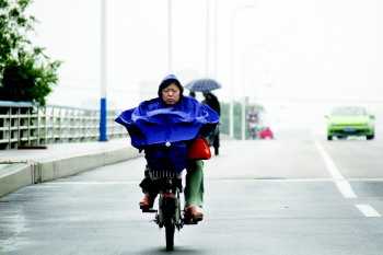 7月10日上午,一场淅淅沥沥的小雨下起来,夏日的闷热一扫而尽。图为东方红路上市民披着雨具赶路。