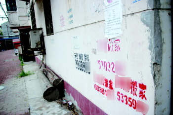 菏泽城区小区内搬家公司的广告随处可见。 本报记者 李贺 摄
