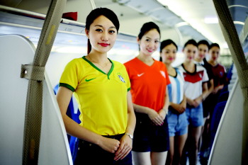 10日、11日,青岛航空乘务员们身着世界杯各队球衣,化身为足球宝贝,在机上与乘客互动。她们向乘客发放投票卡,由旅客预测世界杯冠军得主。赛事结束后,从预测正确的旅客中抽取5名幸运旅客,为其寄送精美礼品。