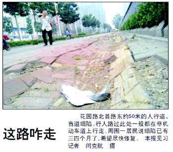6月20日,本报刊发《这路咋走》,报道花园路北首路东约50米的人行道、盲道塌陷问题。7月10日,记者再次经过此地时,道路已修复,可正常行走。据悉,本报刊发报道当天,市公用事业局道路桥梁管理所就到现场查看,6月底修复完成。