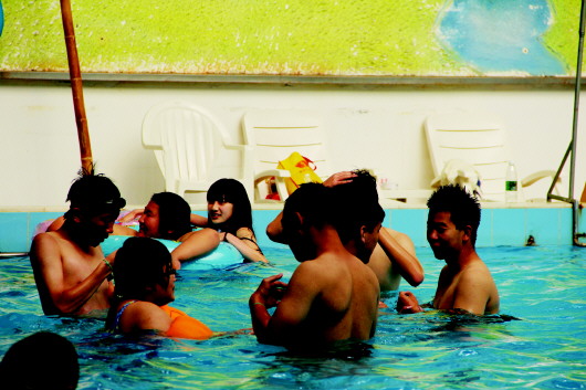 “前天我们刚彻底更换了一次水,具体多长时间更换一次要根据具体情况应变,现在游泳池的水是循环的,到晚上清场后用机器设备将游泳池内的水消毒杀菌。”蒲园游泳馆的负责人王女士说,卫生监督部门不定期来抽查水质,如果不合格是会受到惩罚的。