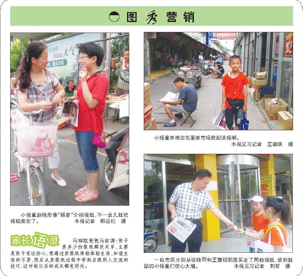 小报童赵晓彤像“顾客”介绍报纸,不一会儿就把报纸卖完了。 本报记者 郗运红 摄