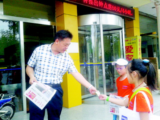 一位市民分别从张晓玥和王慧硕那里买走了两份报纸,受到鼓励的小报童们信心大增。 本报见习记者 刘哲 摄