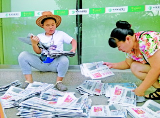 ◤小报童段佳林在妈妈的帮助下,整理领取的160份报纸。