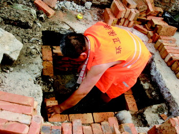 环卫工人正在修建沉淀池。 记者 窦晴 摄
