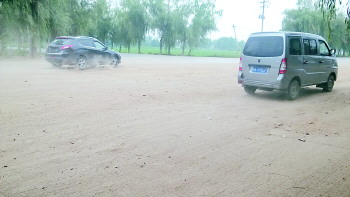 7月10日,记者来到了陈先生所说的十字路口,湖滨小区坐落在十字路口不远处。渣土正好铺在周边道路上,车来车往,尘土飞扬,路人大都掩面而过。小区门口内侧停放的几辆轿车也是被黄沙“侵袭”,挡风玻璃都已经模糊。