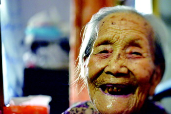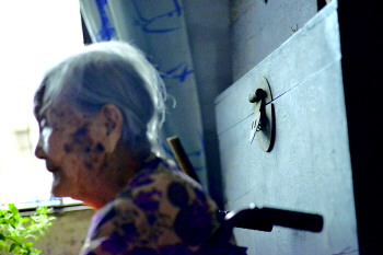 ▲老人身后的大木头箱子跟随了她80多个春秋。
