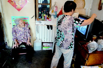 ▲老人每天都看电视,她喜欢看节奏慢的剧情片。