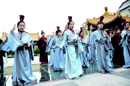 在济南府学文庙,身穿汉服的孩子们在结业仪式上表演。 本报记者 王媛 摄