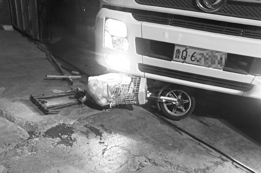 晚上9时30分许,记者赶到位于济南舜耕路和千佛山南路交叉口的一处工地,其门对着舜耕路开放。一辆工程车车头停在工地门口,车头下面有一辆被撞变形的电动车。电动车南侧的地面上残留着大量血迹,工程车的车牌号是临沂的。