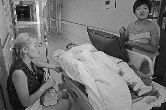 在齐鲁医院,家人焦急地守护着受伤的男孩。 本报记者 杜洪雷 摄