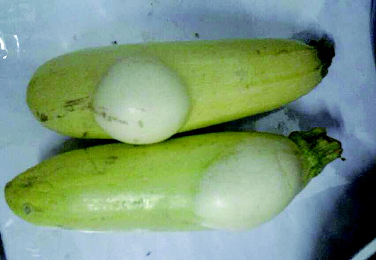 13日,济南市民赵先生告诉记者,图片中的两个西葫芦是5月底时从文化东路三箭吉祥苑菜市场买回家的,“当时买了四根,先吃了两根,没想到剩下的两根放了四五天就开始长个儿,增生出白‘瘤子’。白的地方很硬,最终这两个西葫芦放了近一个月也没坏。”