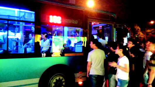 12日晚10时30分,记者在泉城广场发现,通向济南大学方向的102路车,人很多,几乎人挤人。 本报记者 蒋龙龙 摄