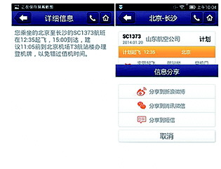 【航班动态】增加了非常实用的“关注”功能,自动推送航班动态信息到用户手机,提供“乘机人”和“接机人”两种关注身份。同时还可以支持通过微博、微信、短信将航班信息分享给好友。