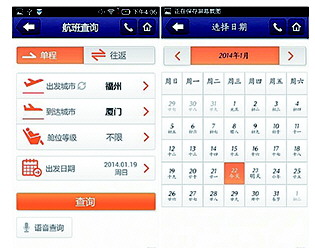 【机票预订】界面统一,功能方面,非常周到的支持舱位等级的选择,以适合不同消费群体。同时支持语音订票功能,支持单程和往返机票查询。日期选择界面提供了农历节气的备注,方便旅客选择合适的出行时间。