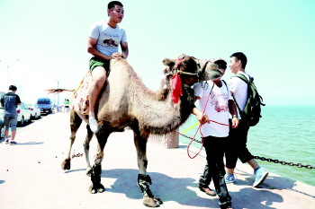 游客多了,也给商家带来不少商机。海边马路上一头骆驼十分引人注意。不少人等着与骆驼合影。