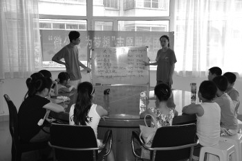 13日,在潍坊市东庄社区活动室,志愿者正在辅导社区学生的英语。据了解,东庄社区联合潍坊医学院社会实践三下乡团队开展了以“微公益、为梦想”为主题的未成年人暑期夏令营活动。为社区里的小学生辅导课程,让孩子们拥有一个健康快乐的暑假。