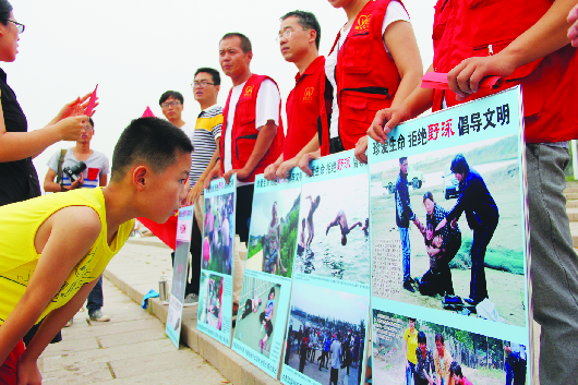 12日下午,本报“野泳劝阻队”一行20余人先后来到中海月亮湾浴场、白鹭湖等地沿湖劝阻野泳者,同时举办“珍爱生命、拒绝野泳、倡导文明”图片展活动。大部分野泳者接受志愿者劝阻,纷纷上岸,并表示今后尽量到游泳池等安全系数较高的场所去游泳。 本报记者 王晓霜 摄