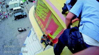 12日,荣成市石岛商港大厦,一5岁男童爬出三楼窗户,沿着墙外约40厘米的凸缘走出约10米被困。附近烧烤摊的“姜先生”第一时间上楼护住男童,为救援赢得宝贵时间。图中穿灰色体恤的男子是“姜先生”,穿消防作业服的是男童。