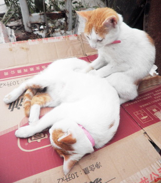 时间:2014年5月23日 自述:一只猫咪前爪放在另一只猫的背上,好像是在帮其按摩。 点评:“亲,这样按摩,舒服吗?”