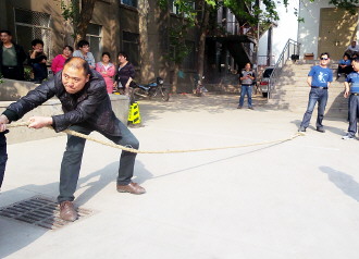 时间:2014年4月29日 自述:拔河比赛,男子在后面用脚踩住绳子,支援一下。 点评:你倒是帮把手啊。