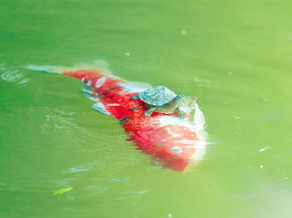 时间:2014年5月21日 自述:乌龟站在游动着的红鲤鱼身上,好似巡视一般。 点评:乌龟好霸气!