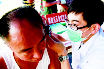 聊城市耳鼻喉医院医生为居民量血压、检查身体。