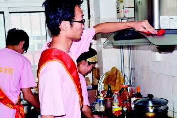 聊大化学化工学院志愿者上门为居民清洗油烟机污渍。