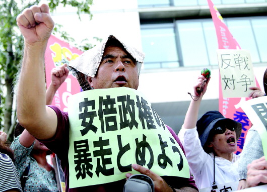 ◥7月14日,日本民众聚集在东京国会前,抗议安倍政府解禁集体自卫权。 新华社发