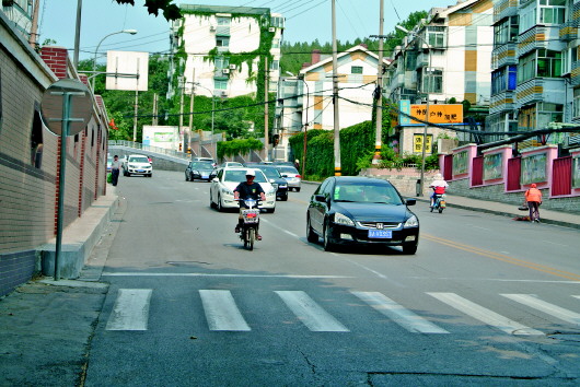 记者14日来到六里山南路看到,路上车辆密集,是双向四车道,两侧的确没有非机动车道。由于道路夹在两山之间,从最东端向西行,先要上一个四五十米的坡,然后下坡,同时,还要向左拐一个约45°的弯,路况颇有些“骇人”。记者观察,六里山南路附近的玉函路、二七新村南路、英雄山路上都有非机动车道。