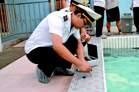卫生监督所工作人员检测游泳池水质。 石剑芳 摄